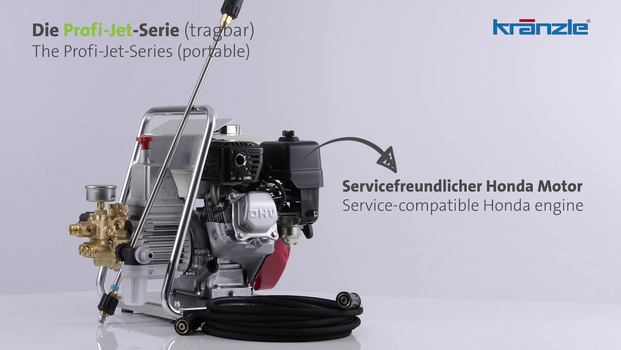 Z myjkami wysokociśnieniowymi Kränzle z silnikiem benzynowym jesteście Państwo po bezpiecznej stronie, gdy wymagana jest najwyższa moc czyszczenia niezależnie od zasilania. Seria Profi-Jet przekonuje niezwykle wytrzymałą obudową ze stali szlachetnej, przyjaznym w obsłudze silnikiem Honda ze zintegrowanym zabezpieczeniem przed niskim poziomem oleju oraz praktycznym systemem przechowywania pistoletu wysokociśnieniowego i lanc czyszczących. Opcjonalna regulacja prędkości zmniejsza hałas i zużycie paliwa.